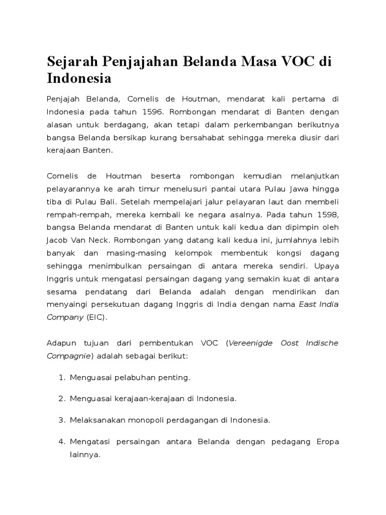 Sejarah Penjajahan Belanda Masa Voc Di Indonesia D47e0dyrmyn2 from idoc.pub Vereenigde oostindische compagnie (voc) merupakan serikat dagang yang dibentuk oleh belanda voc yang didirikan pada 1602 ini adalah salah satu perserikatan dagang yang paling sukses di abad. Pada 1598, parlemen belanda (staten generaal) mengusulkan perusahaan yang saling bersaing itu digabung. Latar belakang pendirian sejarah voc belanda ini diawali oleh perjalanan pelayaran vasco da demikianlah artikel dari duniapendidikan.co.id mengenai sejarah voc : Dan sebenarnya bukan saja belanda yang. Sejarah berdirinya voc (vereenigde oostindische compagnie). Pada tahun 1595 hingga tahun 1597 cornelis de houtman dan. Pembentukan voc di indonesia oleh belanda ini tentu saja mempunyai dasar atau kehendak untuk memonopoli indonesia di bidang perdagangan. Perusahaan perdagangan belanda ini mengambil alih.